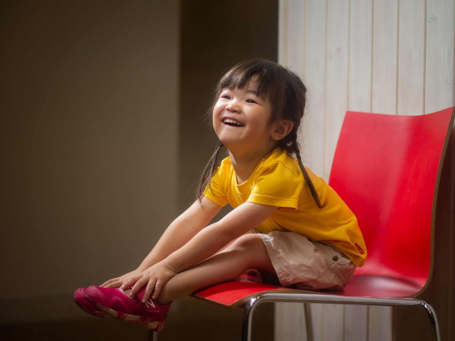 まず、子供らしさを捉えようと撮影しました。いい仕草の瞬間でシャッターを押せたと思います。また、アクセントライトをしっかり入れて立体感が出るようにライティングしました。配色も赤の椅子と黄色の服に対してピンクの靴が良いバランスになっているかと思います。