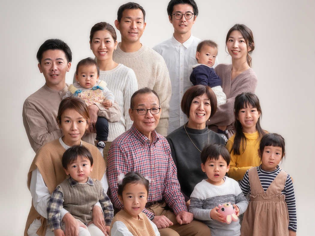 みんなが揃った家族写真、全員の服装から明るい背景を選択してこのご家族の幸せ感を表現しました。背景紙の上で人を表現する写真館ならではの技法、これからも残しつつ新しい表現ができるように精進していきたいと思います。