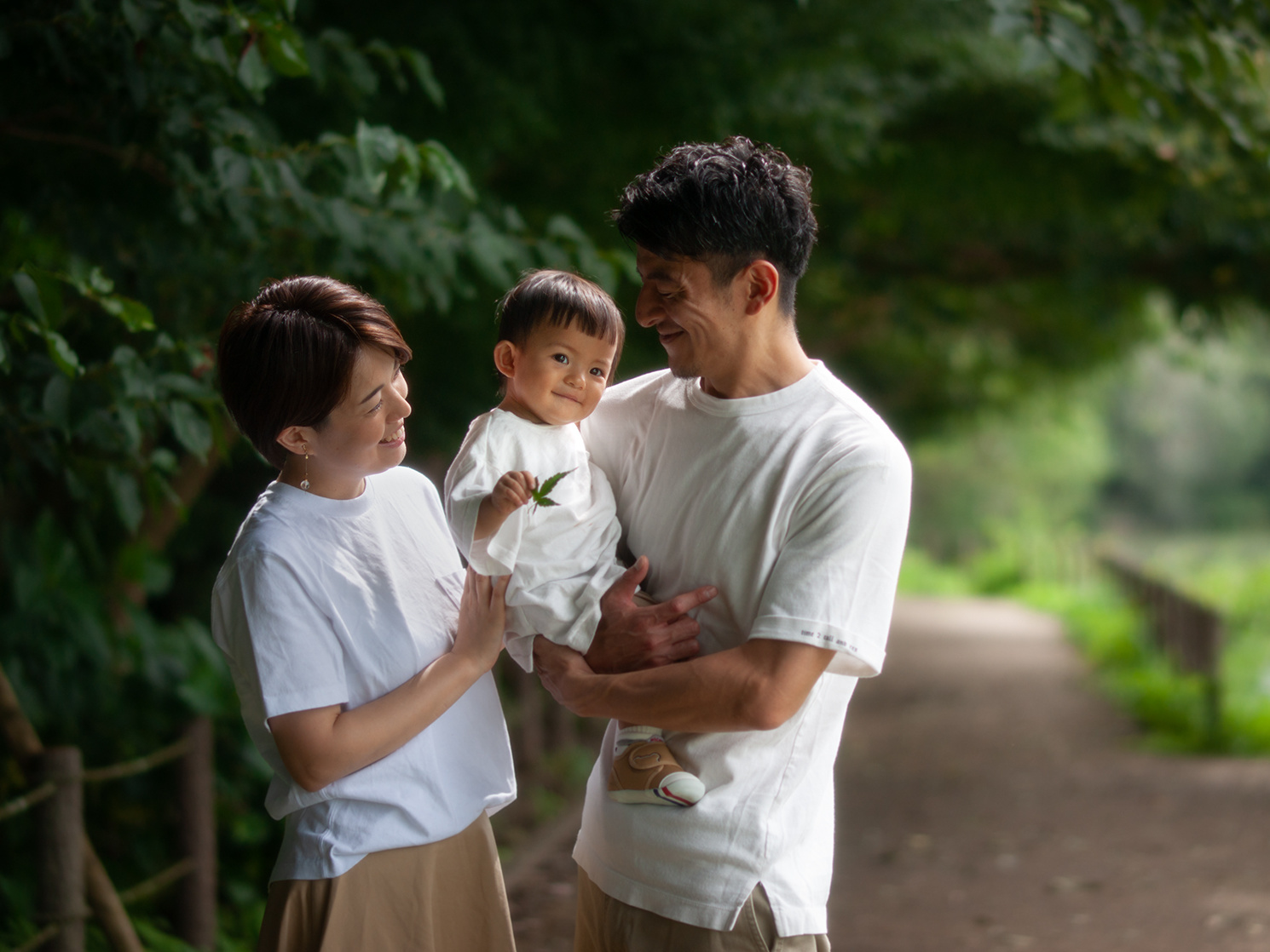 ロケーション撮影をご希望ということもありましたが、まずはこの爽やかなペアルックを活かそうと考えました。背景はあまり日が当たっていない、影の部分を探し、深い緑に白い洋服を配置し、木漏れ日と右奥の抜の部分で立体感と奥行きを意識しました。
