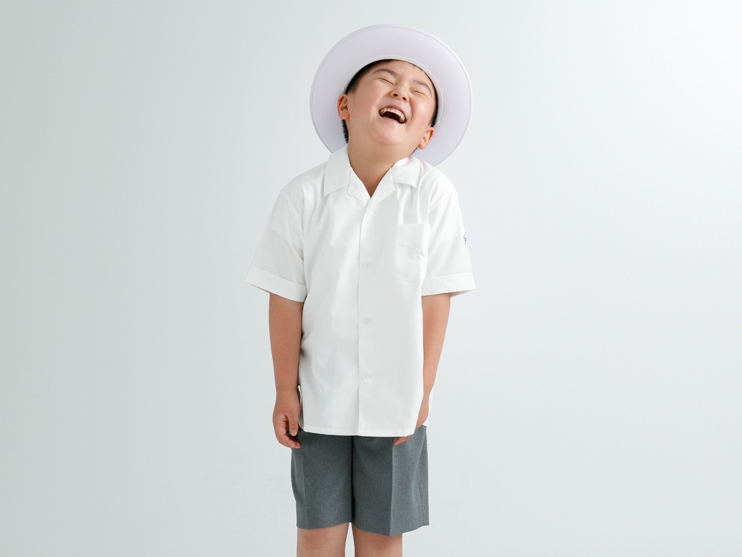 いつもニコニコ笑顔の少年です。夏服に着替え、立ってほしい場所に誘導して、