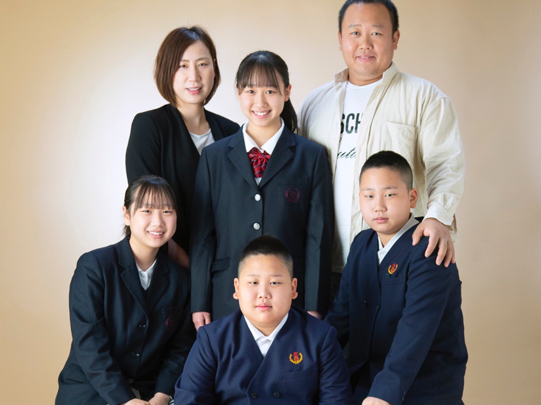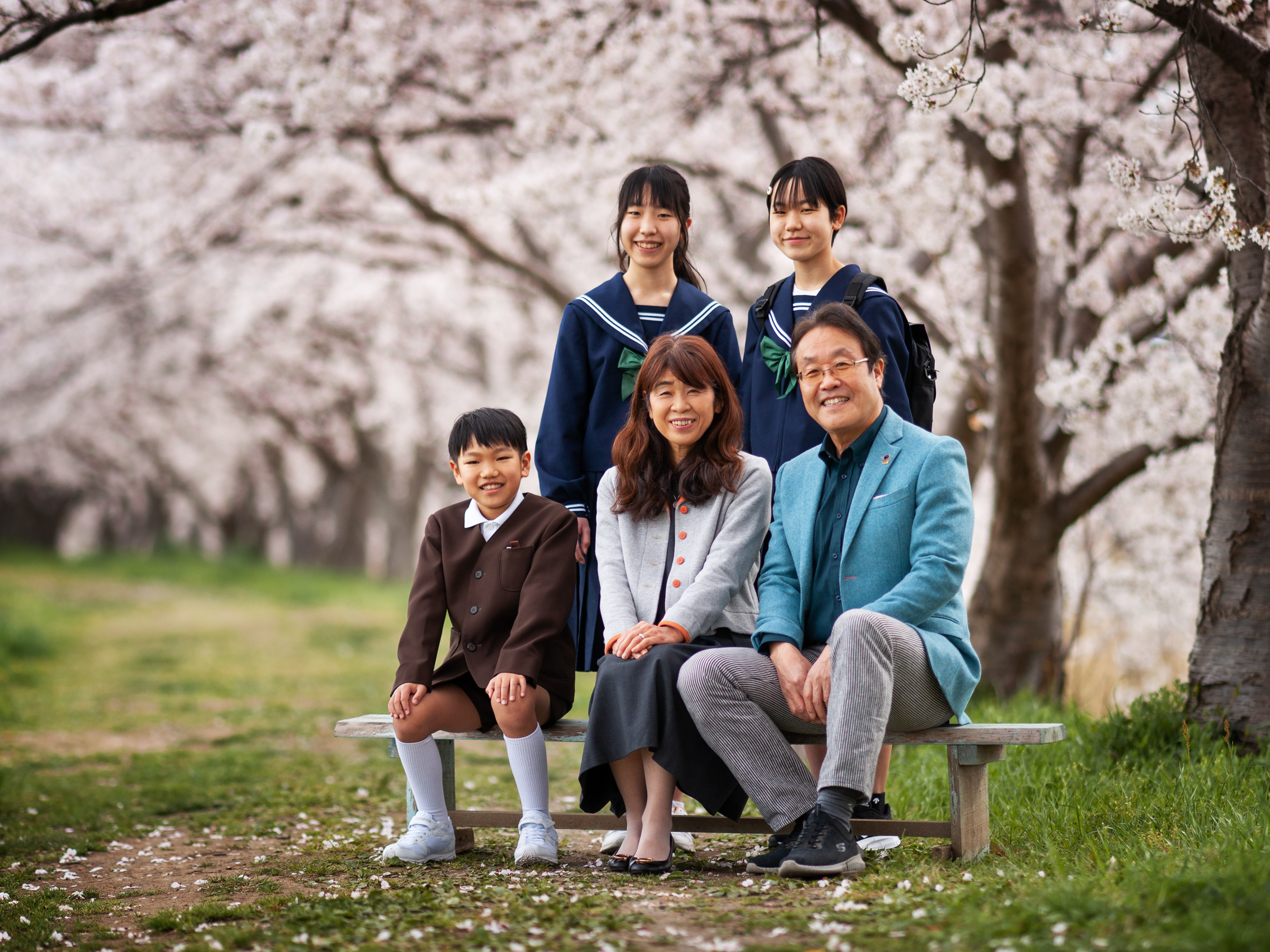 毎年お孫さんと撮影をされるお客様で、今年は桜の下で撮影しました。お父様のジャケットの色も春らしく、学生服姿のお孫さん達も爽やかな笑顔をしてくれました。
