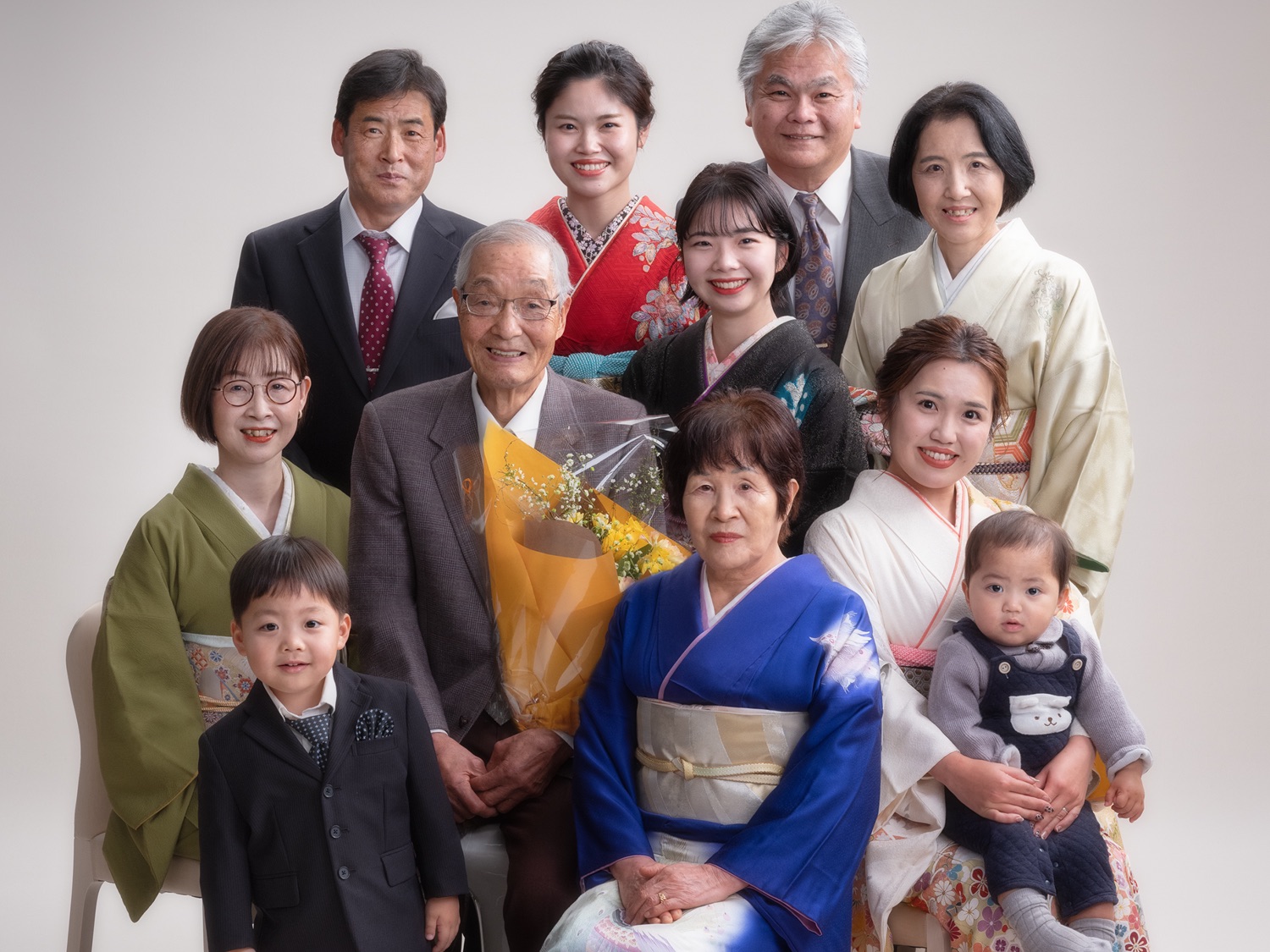 お祖父様の米寿記念で撮影しました。無地の背景で今のこの家族を表現しました。全体のバランスを大切に構図を作り、輝いた瞬間でシャッターを切りました。